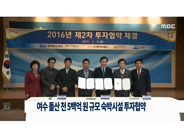 여수시가 관광 숙박시설 건립을 위해천5백억원 규모의 투자협약을 체결했습니다.여수시와 (주)여수예술랜드는오늘, 돌산읍 평사리에 2백실 규모의 숙박시설과 미술공원, 전시관 등을 갖춘 테마형 리조트를 건립하는투자 협약을 맺었습니다.여수시는 또,(주)JDS와 돌산읍 우두리에206실 규모의 생활형 숙박시설투자 협약을 ...