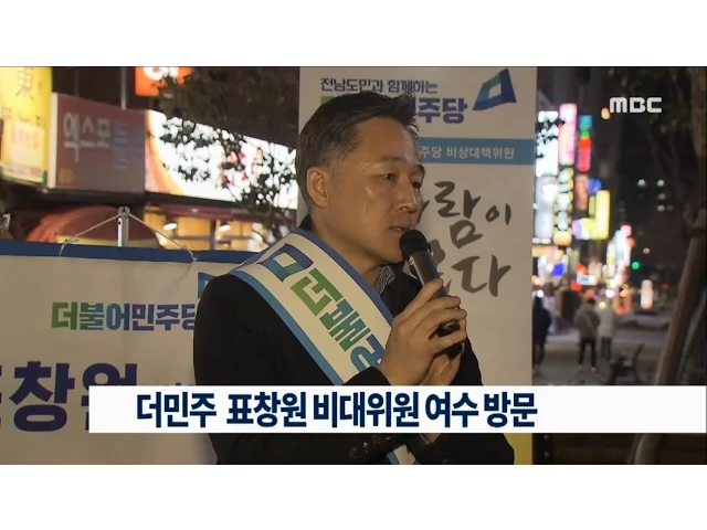 더불어 민주당의 인재영입 1호인표창원 비대위원이 오늘(25) 여수를 방문했습니다. 표 위원은 저녁 7시부터 30분 동안 거리에서시민들과 자유롭게 현 정치상황에 대한 이야기를 나눴고,이후 정책 홍보물을 배포하며더불어 민주당에 대한 지지를 당부했습니다.