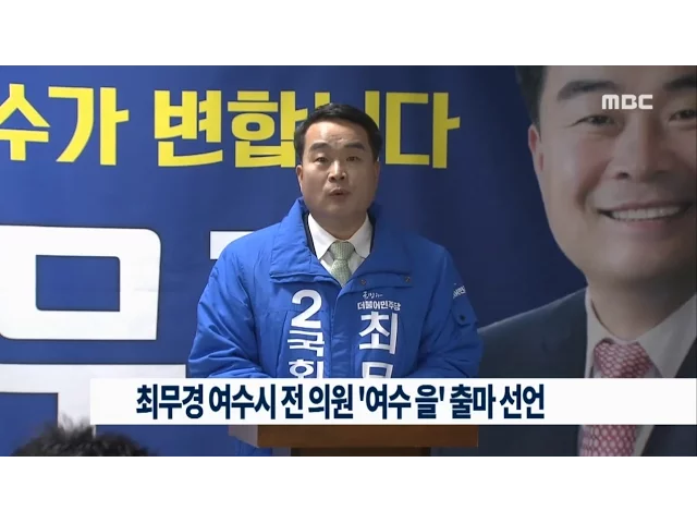 최무경 전 여수시의원이오는 4월, 20대 총선에서 여수 을 선거구 출마를 선언했습니다.최 전 의원은오늘 출마 기자회견에서자신이 국회의원이 되면국제해양시대에 걸맞는창조관광도시 여수 건설을 위해청소년 해양수련원과기상과학관 설립에 나서겠다고 밝혔습니다.최 전 의원은 이어고령화와 저출산 문제를 해결하고여수공...