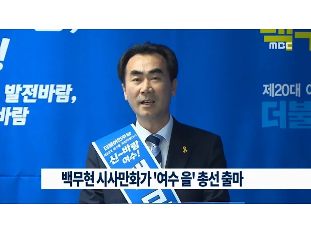 문재인 대표 대선후보 당시선대위 대변인을 맡았던 시사만화가 백무현 씨가여수 을 지역구에 총선 출마를 선언했습니다. 백무현 작가는 오늘시청 브리핑룸에서 기자회견을 갖고여수에서 낡은 인물을 타파하고 지역발전과 당면한 정권교체의 밀알이 되기위해 출마를 결심하게 됐다고 밝혔습니다. 백 작가는 이어지난 20여년...