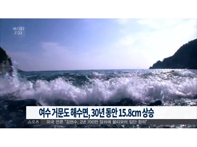 여수 거문도의 해수면이 지난 30년 동안 15cm 넘게 상승한 것으로 나타났습니다.국립해양조사원에 따르면 거문도는 지난 1985년 이후 30년 동안 해수면이 15.8cm 상승해 포항과 제주에 이어 국내에서 상승 폭이 가장 컸고, 여수의 경우 46년 동안 7.9cm가 상승했습니다.해수면 상승률이 지역별로 차이를 보이는 것은지반 ...