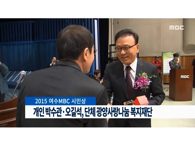 2015 여수MBC 시민상 개인부문에(주)TC테크 박수관 대표이사와금실농원 오길석 대표가 선정됐습니다.박수관 대표이사는 장애인과 독거노인 등 소외계층을 대상으로장학금, 수술비 등을 지속적으로 후원했고,오길석 대표는 20여 년 동안 각종 숲 가꾸기 사업에 수만 그루의 나무를 기증한 공로를 인정받았습니다. 단체부문에...