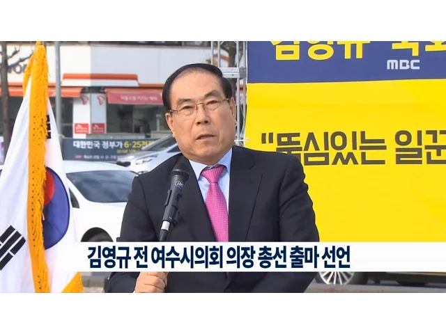 김영규 전 여수시의회 의장이내년 제 20대 국회의원 선거에 출마를 선언했습니다.김 전 의장은오늘 여수시 중앙동 이순신광장에서기자회견을 열고지역의 발전과 사회변화를 이끄는데지방정치만으로는 한계가 있어국회의원에 출마한다고 밝혔습니다.김 전 의장은 이를 위해'통합신당 추진위원회'에 참여한 뒤'변화의 정치, ...