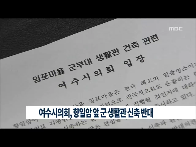 여수 향일암 앞 군 생활관 신축을 놓고 논란이 지속되고 있는 가운데 여수시의회가 '현 위치 건축은 반대한다'는 의견을 밝혔습니다.여수시 의회는 오늘(10일) 의원동의로 성명서를 채택하고 "원칙적으로 현 위치가 아닌 다른 부지에 생활관을 신축하는 의견에 동의 한다"며 "여수시와 시민사회단체 등은 역지사지의 마음으...
