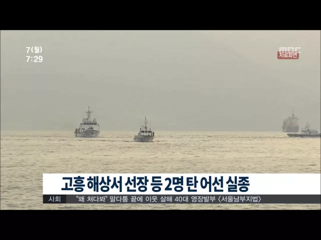 어제(6) 오후 5시 40분 쯤전남 고흥군 과역면 백일도 동쪽 2Km 해상에서0.45톤급 소형어선이 실종됐다는 신고가 접수됐습니다.실종된 선박에는 선장 74살 진 모 씨와 선원 69살 박 모 씨 등 2명이 타고 있었으며,오전 11시쯤 다른 선박들과 함께 조업을 나갔다기상이 나빠지자 항구로 돌아오던 중실종된 것으로 알려졌습니...