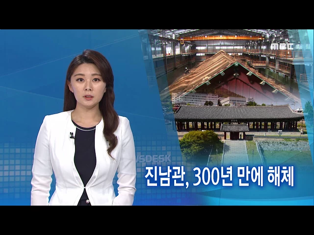 ◀ANC▶건축물 기움 현상으로 붕괴 위험에 놓였던국보 제304호인 여수 진남관이 구조물 해체 작업에 들어갔습니다. 오는 2020년 말이면 새롭게 복원된 진남관의 모습을 감상할 수 있을 것으로 보입니다. 문형철 기자입니다. ◀VCR▶현존하는 지방 관아 건물 가운데최대 규모인 진남관.3백 년 역사...