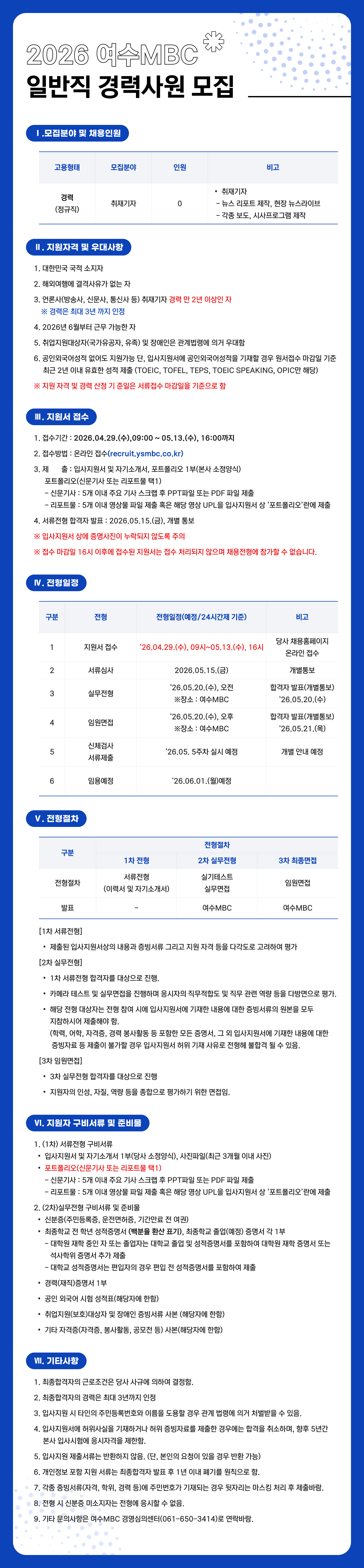 2026 여수MBC 일반직 경력사원(취재기자 분야) 모집 안내