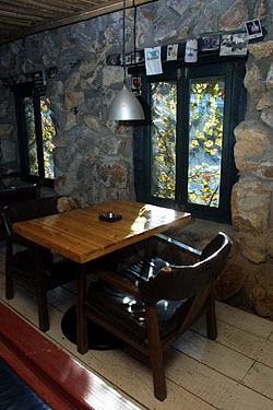 | ⓒ 전라도닷컴 | 처음엔 1층 돌집만 있었는데 작년에 2층을 올렸다. 조금씩 여유가 생길 때마다 집을 지어올린 결과이다. 한꺼번에 뚝딱이 아니라 천천히 만들어가는 집. 찻집 안이나 건물 외벽의 자유분방한 그림들은 주인 김석호씨의 친구가 그린 것. 그 그림들처럼 이 집엔 기성품들이나 대량생산의 것들이 거의 없다. 무어든 이왕이면 직접 손으로 만든 것들, 손때묻은 것들로 집을 꾸려가고 싶은 뜻에서다. 한 번 왔다 스쳐가는 곳이 아니라 매니아들이 많은 곳이라 한다. '그 여행지속에 그 집이 있었지' '언제 다시 한 번 가봐야지'라고 마음속에 꼬불쳐두는 집. 찻집만 있는 게 아니라 민박을 한다. 방은 17개 정도. 한 방에 든 사람들이 절로 친해지고 다정해지게 방이 작다. 혹은 아늑하다. 잠을 자는데 무어 널찍한 공간이 필요할 것인가. '돌집 안의 잠'. 좋은 사람들과 함께, 가족들과 함께 자보고 싶은 방이다. 공동취사장이 마련돼 있어 식사를 직접 해먹을 수도 있다. 바다낚시 배 대여는 물론, 자전거 대여도 한다. 이집 돌벽에 줄줄이 기대어선 자전거들을 보면 내친 김에 자전거 이끌고 훌쩍 보길도 가는 배 타고 싶은 마음이 생기기도 한다.