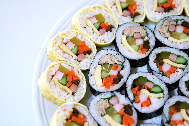 재료 : 밥,김밥용구운김, 햄, 맛살, 단무지, 우엉, 계란, 당근, 오이, 참치, 깻잎