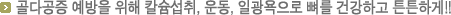 골다공증 예방의 최우선은 나이가 들어 골량이 감소하기 전까지 얼마나 튼튼한 뼈를 만들어 두느냐에 달려있다. 가장 중요한 것은 칼슘이고 다음이 운동이다. 운동으로 자극을 주지 않으면 뼈에 칼슘이 저장되지 않으므로 어렵게 섭취한 칼슘마저도 낭비된다. 운동은 근육이 단련됨은 물론 햇볕을 받아 칼슘흡수를 촉진하는 비타민D를 만드는 효과가 있다.
