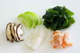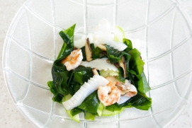 살짝 데쳐낸 불린미역, 새우, 갑오징어에