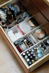 머리끈, 액세서리, 화장품 등을 분류하고 차곡차곡 정리해야 어떤 물건이 어디에 있는지 쉽게 찾고 다시 수납할 수 있다. 립스틱은 립스틱대로, 화장솜은 화장솜대로, 샘플은 따로 상자에 담아서 보관한다. 키 작은 물건들은 2단으로 나눠 수납하는 것도 공간 활용 방법.